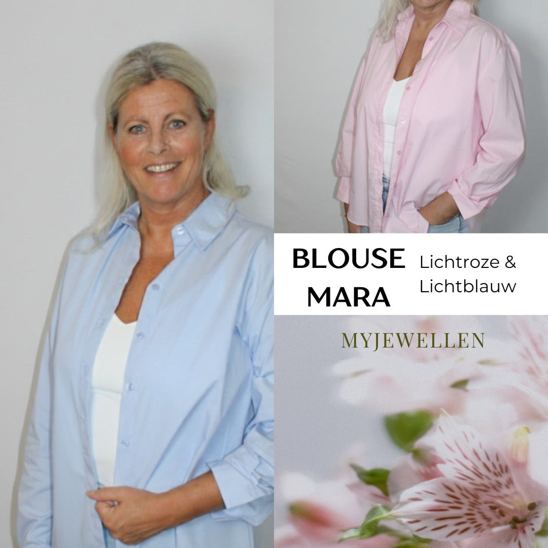 De Blouse Mara is verkrijgbaar in drie prachtige kleuren: lichtroze, lichtblauw én wit (de witte variant staat niet op de afbeelding). Deze stijlvolle blouse is gemaakt van 100% katoen, waardoor hij ademend, comfortabel en ideaal is voor dagelijks dragen. De soepele pasvorm en frisse kleuren geven elke outfit een elegante, tijdloze uitstraling. Perfect voor zowel casual als chique looks.