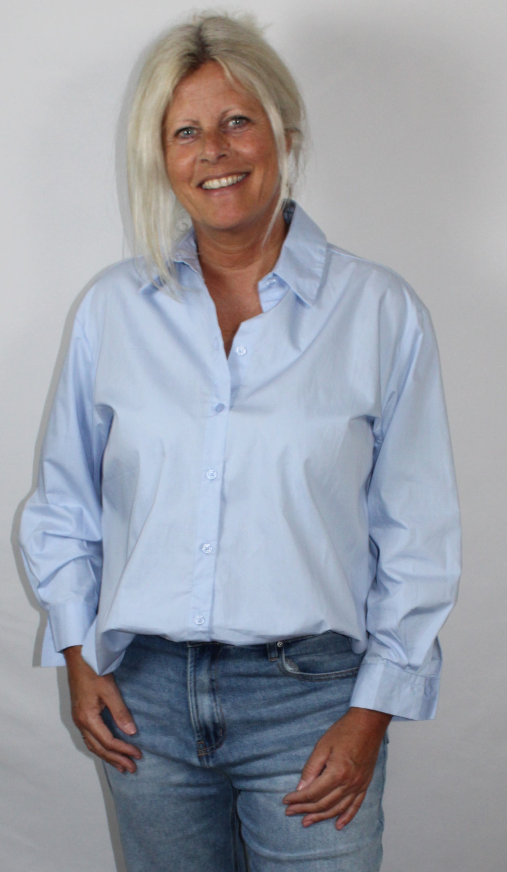 Ontdek de elegante Mara Blouse in lichtblauw katoen. Perfect voor elke gelegenheid, van werk tot weekend. Gemaakt van hoogwaardig katoen voor ultiem comfort. Deze ruimvallende blouse is aan de achterzijde iets langer dan aan de voorzijde.